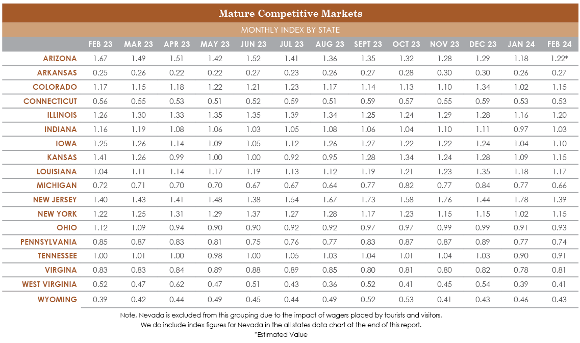 In terms of industry seasonality, February ushered in the expected downturn in overall handle from January as each of our Mature Competitive States saw a decrease in handle versus the prior month’s totals. But following New Jersey’s lead, the chart below demonstrates healthy growth in year-over-year comparisons for most of these states, with a 17.27% overall increase. While at the time of this writing Arizona had yet to report February data, we have estimated small decline in YoY due to an inflated 2023 February total when the Grand Canyon state hosted Super Bowl LVII.